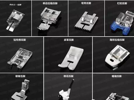天津縫紉機(jī)配件中常用的還有高低壓腳、滾輪壓腳、劈縫壓腳、滾邊壓腳等,需要根據(jù)需要和面料類型來選擇。壓腳更換時(shí)還要根據(jù)面料的厚度來調(diào)整壓腳的壓力,來更好配合縫制。